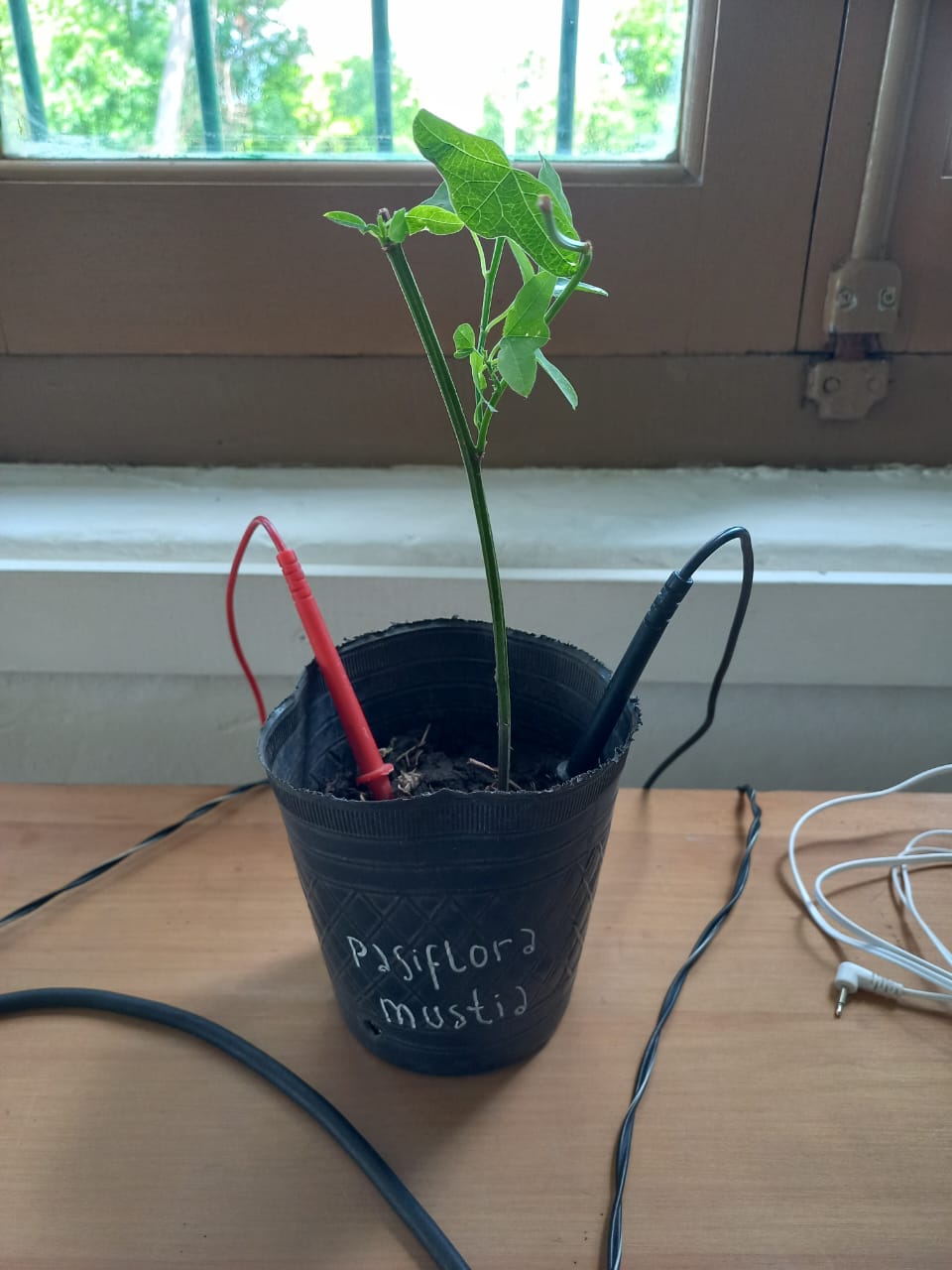 Elegir la especie con la que voy a colaborar en general es una decisión importante. En este caso, conecte los electrodos a una «Pasiflora Mustia» y era fundamental que sea una especie nativa. La intención era que las personan la conozcan, para que la experiencia de escucharla sea más cercana, que tengan una relación directa con la planta y en ese momento puedan escucharla también. Durante la muestra final de la residencia, muchas personas me contaron historias personales hermosas con esa planta.
