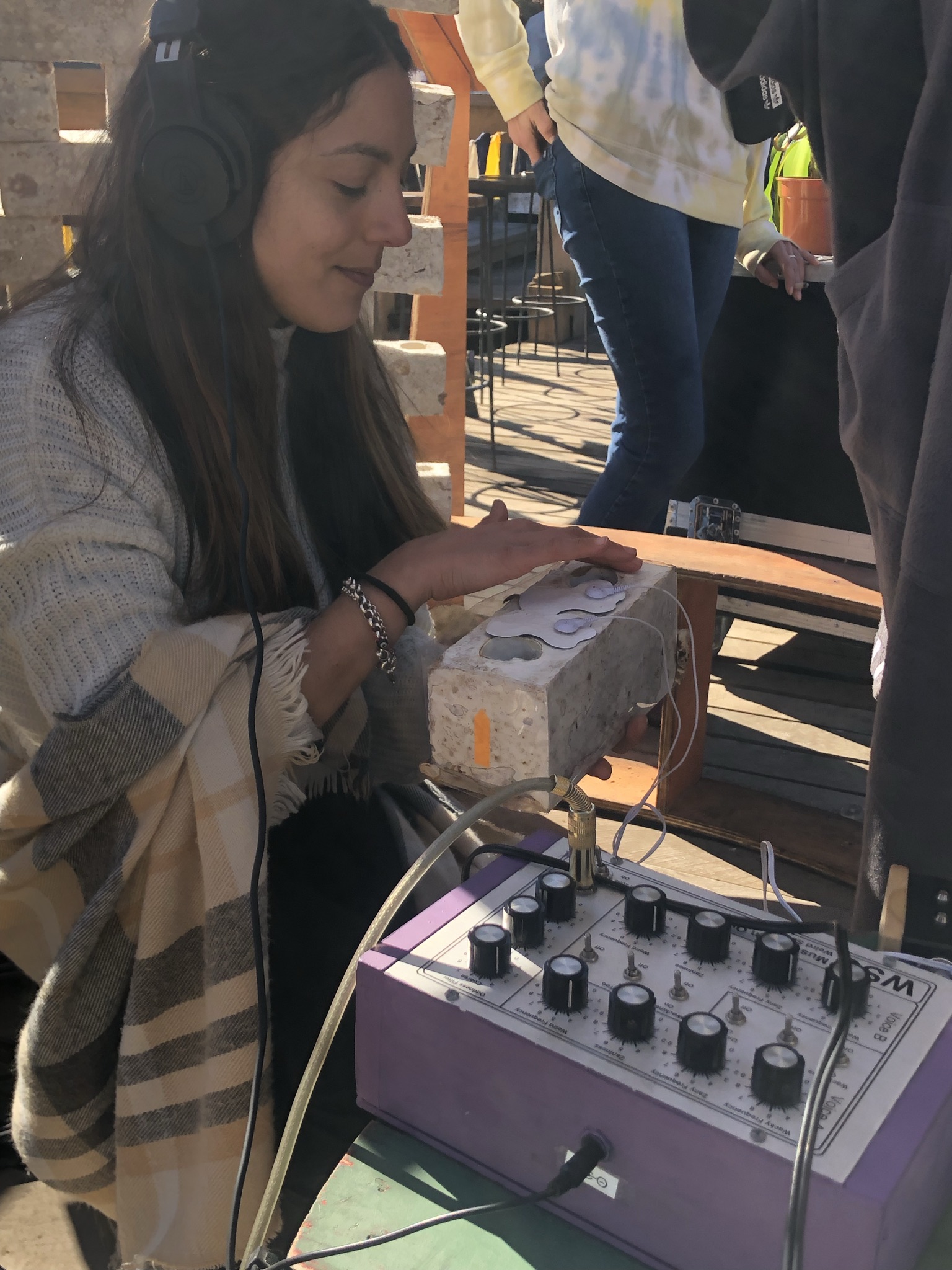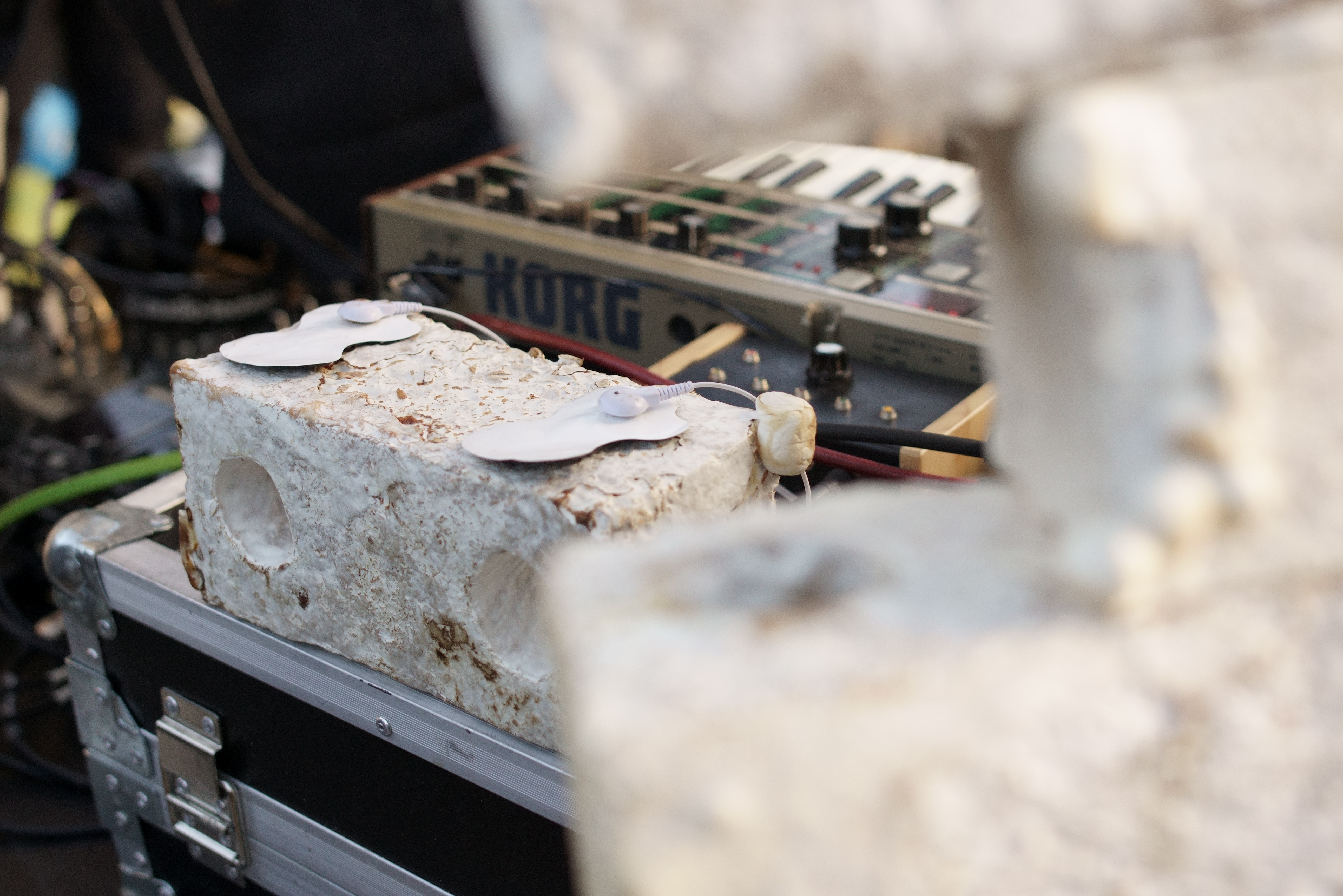 Para poder realizar la sonificacion del Micelio, se utilizaron los ecoladrillos fabricados por el estudio SUPERPRAXIS especialmente diseñados para la instalación “Refugio Fungico”, quienes me convocaron para realizar la sonificacion de la instalación .